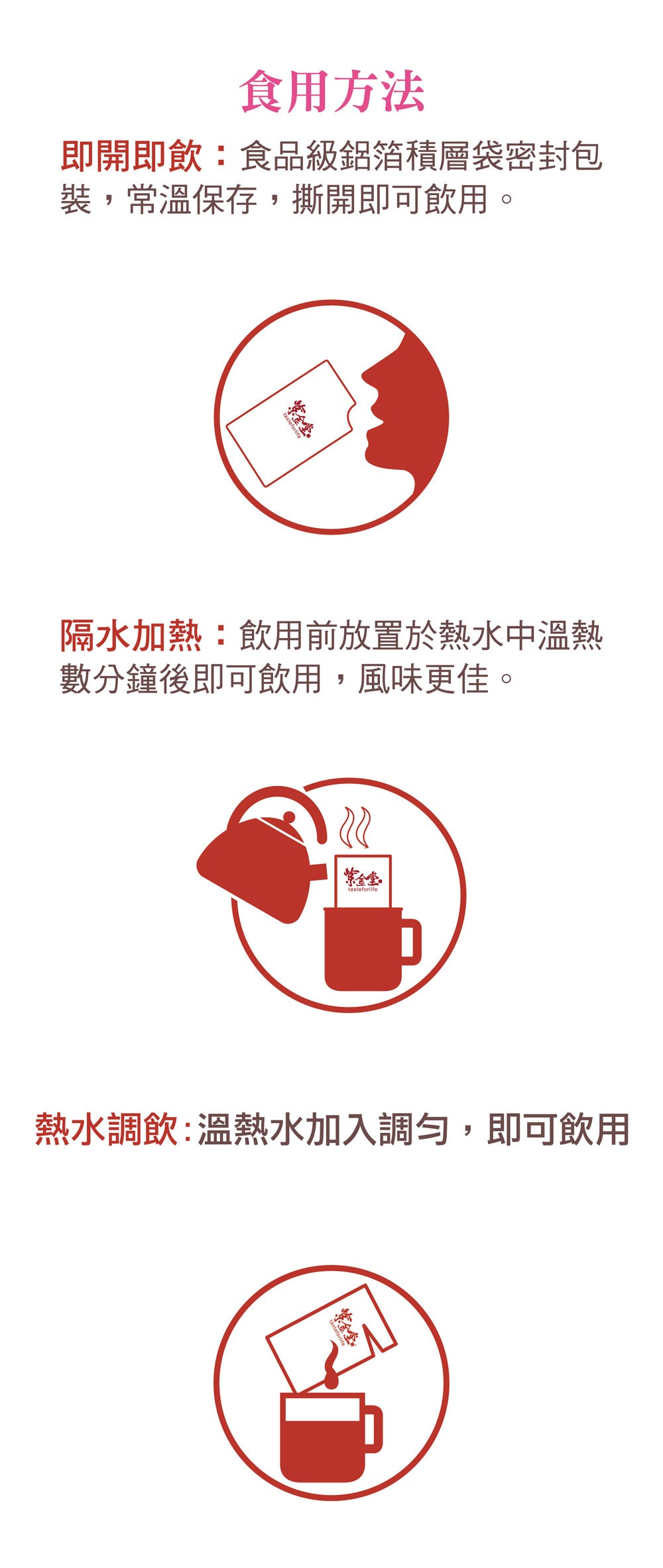 使用說明:飲用前放置熱水中3到5分鐘,取出剪開即可飲用。
